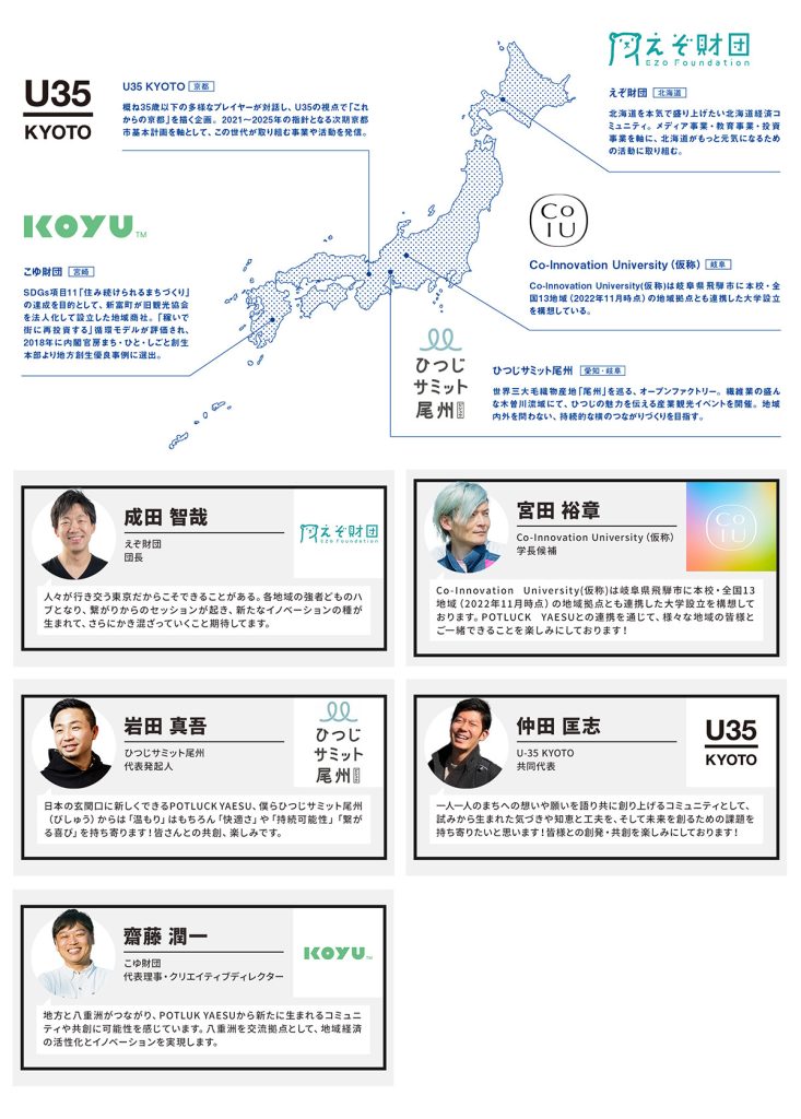 本プロジェクトは、地域経済メディア「NewsPicks Re:gion」様と共創し、「POTLUCK(ポットラック)」=「持ち寄る・集ま る・つながる」をキーワードに、日本各地の挑戦者のつながりを加速させることを通じ日本全国におけるさらなるイノベ ーション創出と日本経済の活性化に寄与することを目指しています。