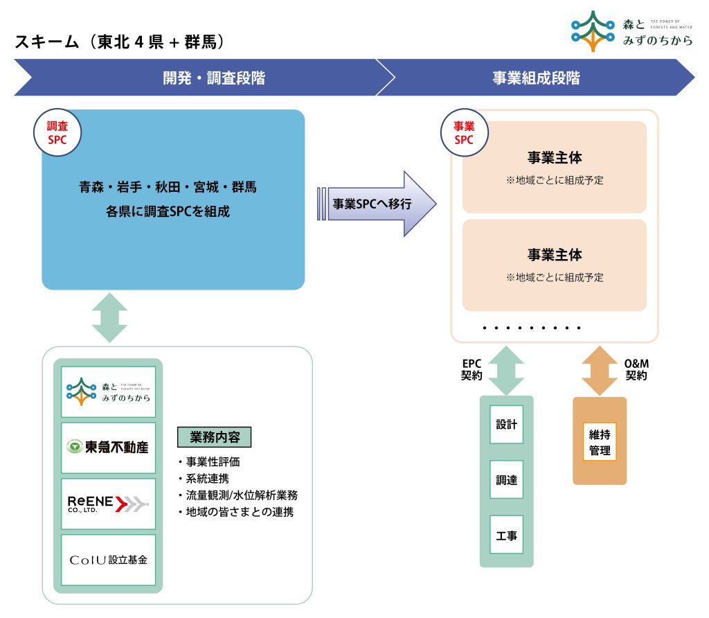 森とみずのちからと東急不動産並びにリエネは、太陽光・風力発電事業を全国で実施する知見・ネットワークを活用し、カーボンニュートラル実現に向けた日本の固有の水資源活用策として、発展途上の小水力発電事業(以下、「本事業」)の事業拡大推進を行い、最大の小水力発電コンソーシアムを目指しています。