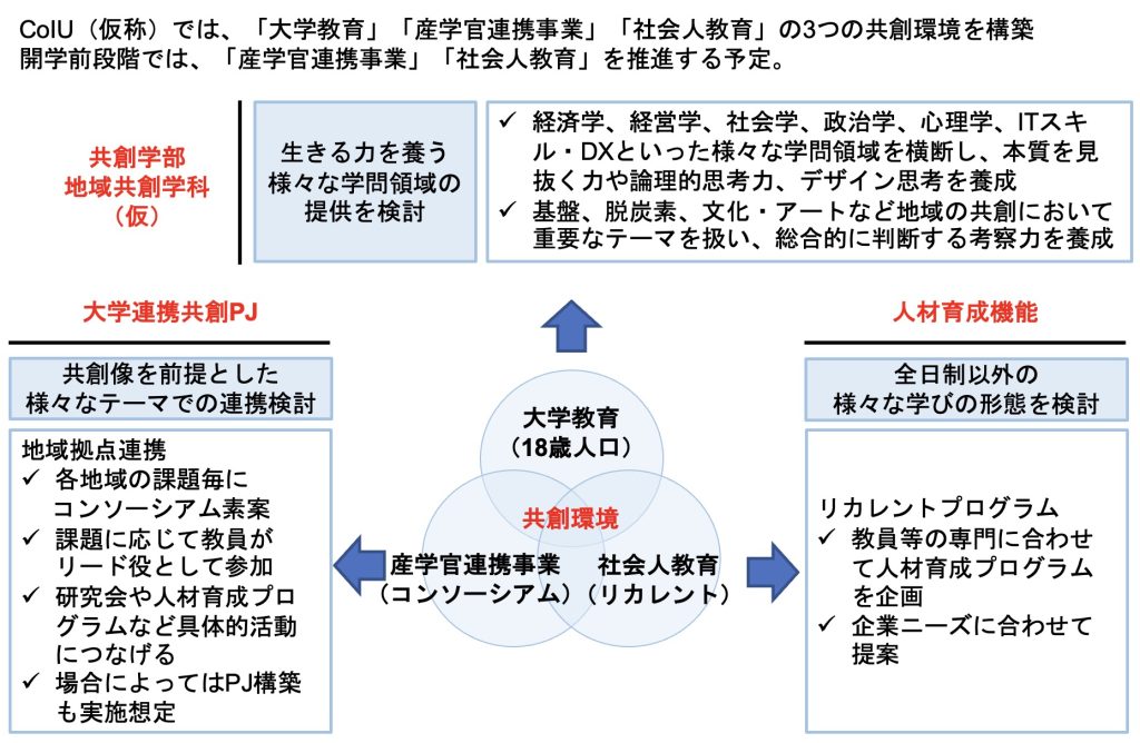CoIU(仮称)における大学教育構想のみならず、現在『共創を促進する機関の設置構想』内にて検討を進めている『社会人のリカレント教育』および『産学官連携のコンソーシアム事業』に関しても様々な連携を想定しています。