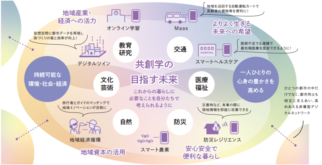 私たちは共創学を通じて、「人々がより良く生きる豊かな未来」につながる新たな価値創造を目指し、多様な人々、コミュニティ同士が互いのために補完しあい、またその価値を高めあいながら、持続的に課題解決および社会変革に向け協働することを構想しています。