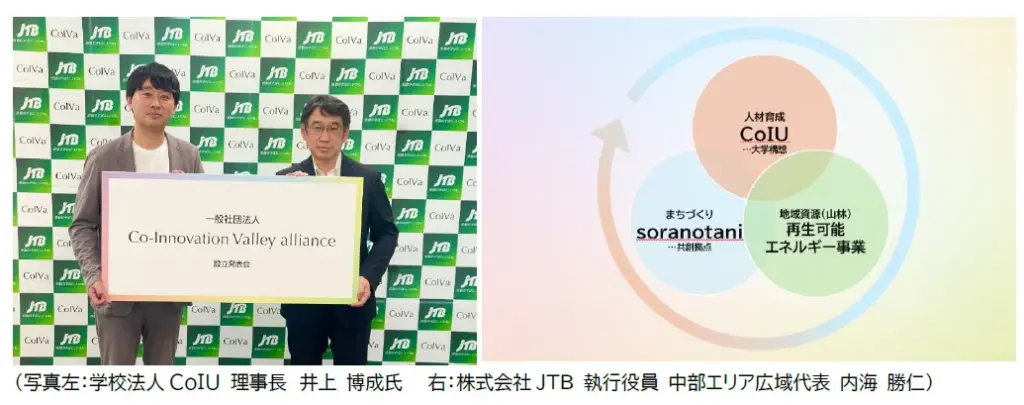 2026年4月に開学予定の本学をはじめ、共創拠点施設「soranotani」、再生可能エネルギー事業を三位一体で推進する地域共創プロジェクト「Co-Innovation Valley(CoIV)」の加速に向け、株式会社JTBと学校法人CoIU理事長井上博成は、一般社団法人「Co-Innovation Valley alliance(CoIVa)」を設立いたします。CoIVaは、2026年4月に開学する大学「Co-Innovation University(以下、CoIU)」、共創拠点施設「soranotani」、再生可能エネルギー事業を三位一体で推進し、持続可能な地域社会の実現を目指す共創プラットフォームとして機能します。