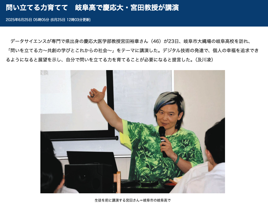 【掲載報告】中日新聞に学長候補 宮田が岐阜高校で行った講演の様子が掲載されました